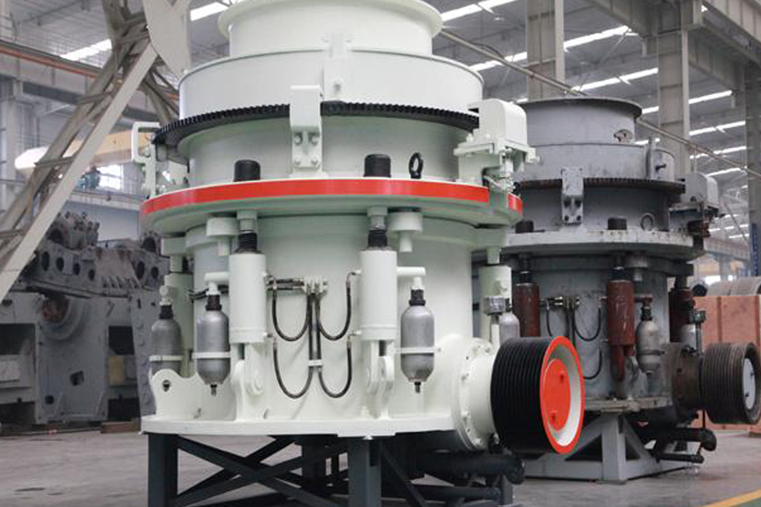 - 結(jié)構(gòu)組成 ---- 圓錐破碎機的主體結(jié)構(gòu)通常由機架、偏心套、主軸、動錐體(含破碎壁)、定錐體(含軋臼壁)、傳動裝置、液壓系統(tǒng)、潤滑系統(tǒng)及電氣控制系統(tǒng)等關(guān)鍵部件構(gòu)成。其中,動錐體通過偏心套的旋轉(zhuǎn)驅(qū)動,在主軸約束下做復(fù)雜的旋擺運動,與定錐體共同圍合形成逐漸縮小的破碎腔。物料在腔內(nèi)歷經(jīng)多次反復(fù)的擠壓、沖擊與彎曲作用而逐步破碎,并依靠自重從排料口排出。